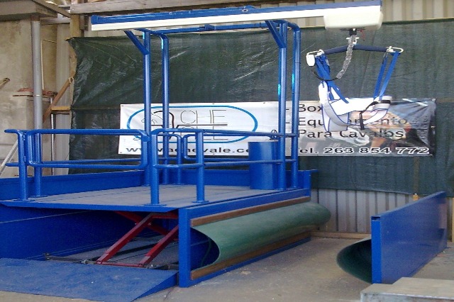HIPOTRANSFER associa num só equipamento uma plataforma elevatória (até 1,2m) com um elevador de transferência que permite que a partir da cadeira transportadora após a subida da plataforma com a colocação de um arnês a partir da posição de sentado se eleve o utilizador e por translação do carril, seja levado à vertical do cavalo e se instale na sela por descida do elevador. O regresso à cadeira transportadora é garantido com a ação inversa e o regresso ao nível do solo por descida da plataforma.